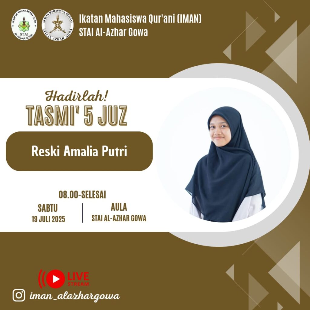 Makassar, 19 Juli 2025 – STAI Al-Azhar Gowa melalui Ikatan Mahasiswa Qur’ani (IMAN) kembali menyelenggarakan kegiatan Tasmi’ Al-Qur’an sebagai bentuk pembinaan dan pengembangan kemampuan mahasiswa dalam menghafal dan menyetorkan hafalan Al-Qur’an. Kegiatan ini dilaksanakan pada Sabtu, 19 Juli 2025, di Aula STAI Al-Azhar Gowa dengan menampilkan Reski Amalia Putri mahasiswi semester 4 program studi Ekonomi Syariah, dan salah satu mahasiswi berprestasi yang berhasil menuntaskan Tasmi’ al-Qur’an sebanyak 5 juz.